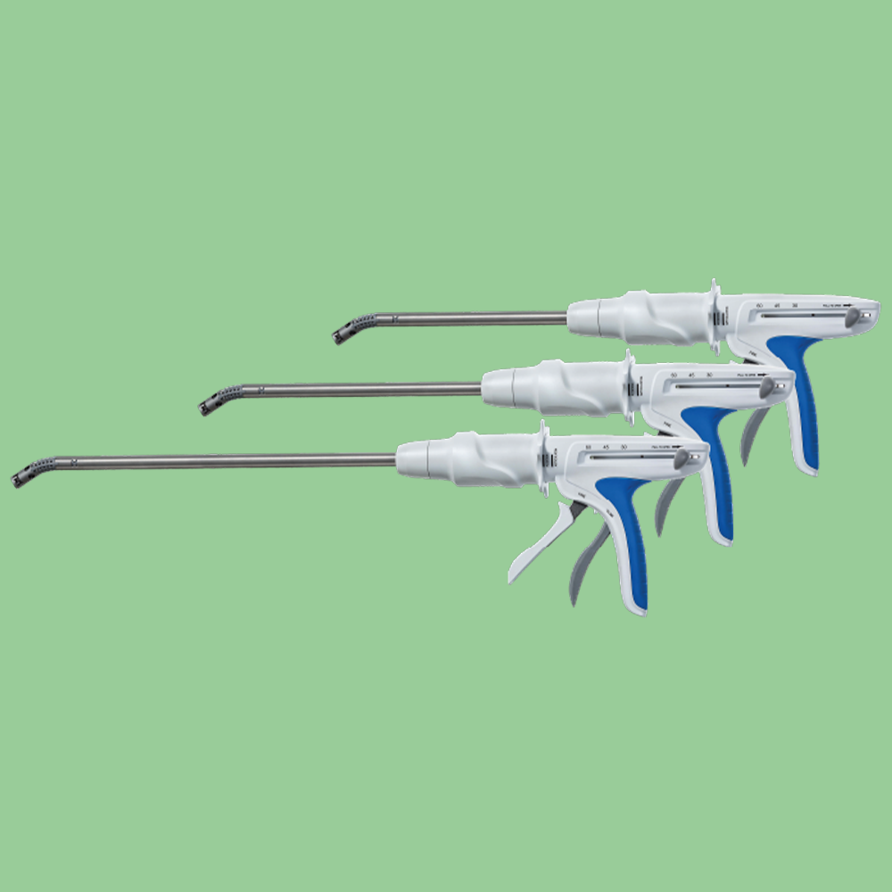 Grampeador endoscópico Pré-compressão tecidual. Previne deslizamento do tecido. Sistema inovador de articulação e rotação. Articulável em qualquer angulação até 45 graus. Nova lâmina a cada disparo. Cortes precisos, melhorando a formação da linha de grampos.